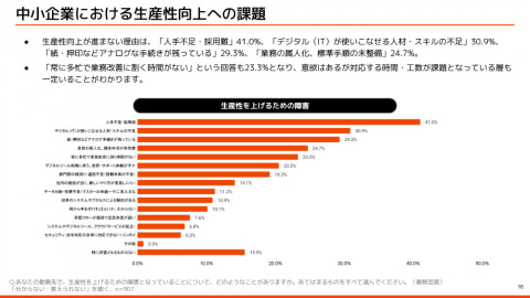 そのアンケート結果によると、中小企業の生産性向上の課題として最も回答が多かったのは「人手不足・採用難」で41.0%であり、これは従業員規模を問わず最多の回答だった。
