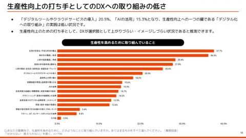 生産性向上の打ち手として最も多かったのは「仕事の簡素化・不要な手順の廃止」で37.7%、次いで「働き方の見直し・改善」で36.3%となった。一方、「デジタルツールやクラウドサービスの導入」は20.5%、「AIの活用」は15.3%にとどまっており、デジタル活用による取り組みを実践している中小企業は決して多くない。