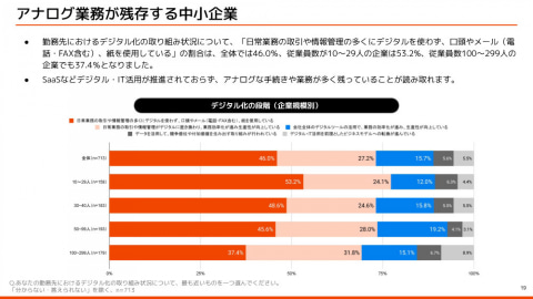 また、「日常業務の取引や情報管理の多くにデジタルを使わず、口頭やメール(電話・FAXを含む)、紙を使用している」という回答は46.0%に上った。何らかのデジタルツールを活用し、業務改善に取り組んでいるという回答も50%を超えているが、半数弱が依然としてアナログ業務を利用していることになる。