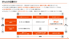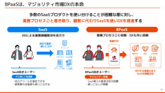 もちろん中小企業でも、SaaSを導入し自社でDXによる業務改善を進められるところもあるが、SaaSの導入や活用が自社では難しい企業をBPaaSの対象と想定。依頼する業務を業務プロセスごとに分けることで、低コストで導入することを想定している。