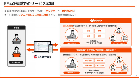 中小企業向けBPaaSを展開する場合、効率良く業務支援を行うことが鍵となるが、kubellのもともとの事業であるビジネスチャット「Chatwork」を活用し、顧客支援を行うことで、「電話や対面に比べ、非同期コミュニケーションによる支援が可能になることが強みだ」という。