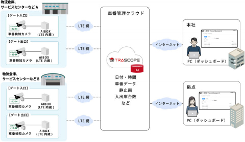 そこで同社は、今回、物流拠点の出入口に設置した車番検知カメラとAIBOX、車番管理クラウドを組み合わせ、トラックの入場・退場時刻を自動で取得・蓄積する「新物流効率化法対策ソリューション」を提供する。