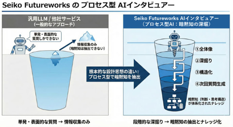 こうして抽出された有識者の知見や判断基準は、Seiko Futureworks上で即座にAIエージェントとして反映可能で、セイコーソリューションズでは、組織の競争力を高めるための本質的な知見を蓄積できるとそのメリットをアピールしている。