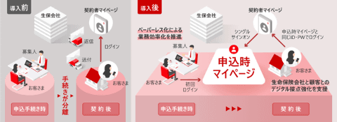 申込時マイページサービスは、申込時に登録した情報や認証結果と、これまで生命保険会社で保険の申し込み手続きとは別に手続きが必要だった契約後のマイページ(以下、契約者マイページ)を、シームレスに連携することで、契約成立後の契約者マイページの開設を促進する。