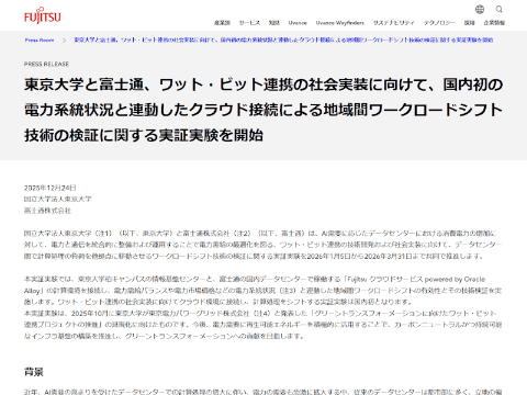国立大学法人東京大学と富士通株式会社は24日、AI需要に応じたデータセンターにおける消費電力の増加に対応するため、電力と通信を統合的に整備・運用して電力需給の最適化を図る「ワット・ビット連携」の技術開発および社会実装に向け、データセンター間で計算処理の負荷を移動させるワークロードシフト技術を検証する実証実験を共同で推進すると発表した。