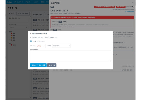 また、検出されたリスクに対してステータスを追加し、進捗状況などを管理できる機能も提供する。現時点では、「未確認」「保留」「対応予定」「対応中」「対応完了」「対応不要」といったステータスを追加可能だ。
