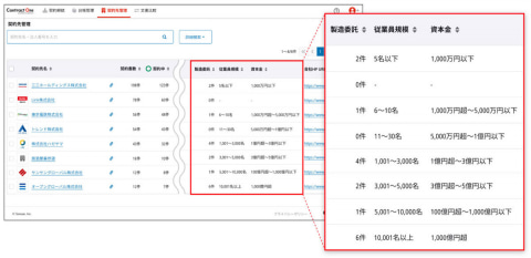 またContract Oneでは、契約書に記載された内容を基に、支払条件や取引区分など、あらかじめ設定した項目をAIが自動で抽出し、台帳に入力する「拡張項目のAI自動入力」を提供しており、例えば「製造委託」「修理委託」など、取適法で確認したい取引区分を項目として設定することもできる。これを「対象契約洗い出し」機能と組み合わせることで、各項目について、企業ごとに該当する契約書の件数を確認できるとのこと。