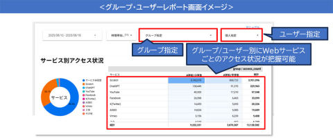 また、すでに提供されているグループ・ユーザー別レポートを強化し、可視化機能を追加した。指定した学校・学年・クラスなどのグループ単位、特定の児童・生徒などユーザー単位で絞り込みを行え、グループ・ユーザー別にWebサービスごとのアクセス数を可視化できる。これにより、生徒が授業以外の時間帯にどのようなWebサービスを使っているかなど利用状況を詳細に分析できるとしている。