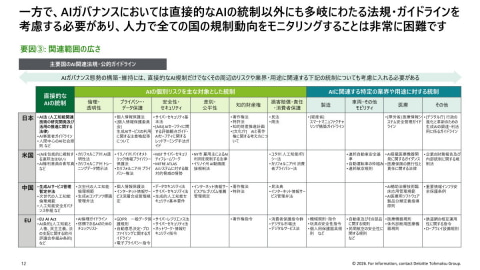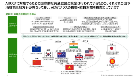 具体的には、「各国の規制方針の違い」では、国によってAI規制に関するスタンスが大きく異なるため、すべてを包摂するような体制構築は難しいのが実情。AIリスクに対応するための国際的な共通認識の策定は行われているものの、それぞれの国や地域で規制方針が異なっており、AIガバナンスの構築・維持対応を複雑にしている。「例えば、EUで施行されているAIシステム提供に関する規制『AI Act』は、EU域内でAIシステムを上市するすべての事業者に対してAIシステムの種別に応じた対応を求めており、従わない場合は罰則が科される」という。