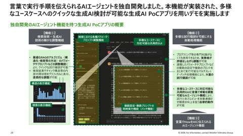 説明会で山本氏は、AIエージェント機能が実装された、多様なユースケースへのクイックな生成AI検討が可能な生成AI PoCアプリを用いたデモを実施。「この生成AI PoCアプリでは、最適なRAGのアルゴリズム(構造化・検索等の方法)のパラメータやプロンプトなどの細かな調整機能により、試行錯誤をクイックに行うことができる。また、プログラミングなどの専門知識がなくても、多様かつ大量の試行錯誤を可能にする自動処理機能を搭載。さらに、言葉で実行手順を伝えられるAIエージェント機能によって、試行と自己レビューを自動連鎖させ精度の向上を狙う自律的動作が可能となっている」と、生成AI PoCアプリの概要を紹介した。