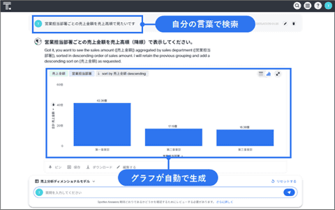 ThoughtSpotは、検索エンジンのようにキーワードを入力するだけで必要なデータを即座にグラフ化でき、専門知識が必要なダッシュボードを手間をかけて作成することなく、スピーディなデータ分析を可能にする。