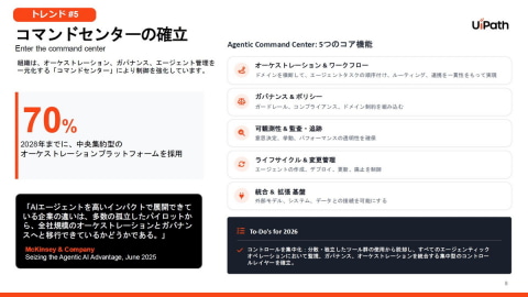 5つめの「コマンドセンターの確立」では、70%の組織が2028年までに、中央集約型のオーケストレーションプラットフォームを採用するという調査結果を示す一方で、マルチAIエージェントの進展と同時にオーケストレーション、ガバナンス、エージェント管理を一元化する「コマンドセンター」による制御の強化が重要になると指摘。