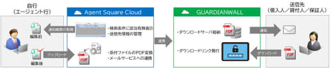 メール連携による帳票送付は、Agent Square Cloudから出力した帳票(Excelシート)がPDF形式に変換され、ダウンロードリンクとして送信先に通知される。受信者は安全なダウンロードサイトから帳票を取得できる。