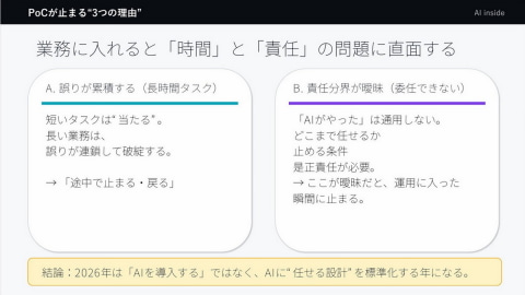 単発タスク中心の導入では必要なかった設計だが、業務を完遂するには重要な点だ。「2026年は企業側の評価軸も、AIで何ができるかではなく、AIで業務を完遂できるかどうかへと変わっていくだろう」と渡久地氏は述べている。