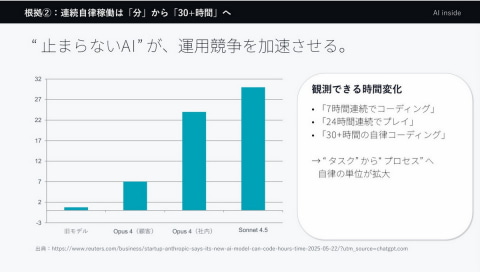 技術的には、すでにAIによる長時間業務も可能になっている。例えばAnthropicのClaudeでは、Opus 3.5の段階で7時間連続のコーディングが可能になり、Opus 4では24時間連続でゲームをプレイしてクリア、さらにSonnet 4.5では30時間以上の自律コーディングができるようになった。