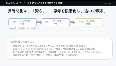 これは、AIが思考を段階化し、途中で戻って確認し、もう一度試行するという「プラン」「アクト」「チェック」のような基本動作ができるようになったためだという。こうしたモデルの登場により、「考えて答えを出すことがAIの基本動作となった。その結果、長時間タスクをこなす能力がどんどん伸びている」と渡久地氏は説明する。