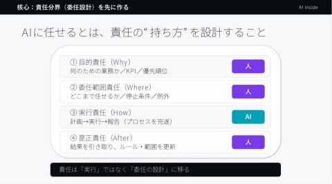そのために必要なのが「責任の持ち方を設計すること」だ。誰が責任を負うかではなく、どのように責任を分担して業務プロセスを設計するかが重要になるという。業務の目的を人間が定め、どこまでAIに任せるかを事前に決め、実行部分はAIが担い、完了後の是正やルール更新は人間が行うといった具合だ。