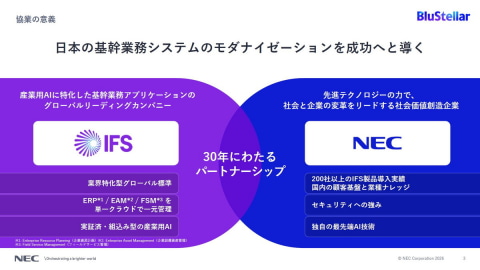 IFSは、グローバルで数多くのERPの導入実績を持ち、NECとは約30年にわたるパートナーシップがあるという。日本では、鉄鋼、化学、部品メーカーなど、200社以上にIFS製品を導入してきた。今回の新たな協業により、日本の基幹産業が直面する課題に対応し、AIを活用したDXの基盤となる基幹システムへとモダナイゼーションを促進することができるとしている。