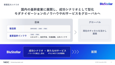 戦略的協業による新サービスの提供では、製造業や航空宇宙、エネルギー、交通輸送、公共インフラなど、日本の重要基幹インフラを支える資本集約型産業の顧客に対して、サプライチェーン管理や設備資産管理、現場サービス管理など、基幹業務のモダナイゼーションとDXを促進するほか、顧客が製品とサービスを融合させ、新たな収益源を創出する「サービタイゼーション」の実現にも貢献するという。サービス提供は、2026年度中に開始する計画であり、BluStellar Scenarioで進めている業種ごとの「型化」の第1弾になるという。