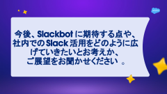 最後の質問は「今後、Slackbotに期待する点や、社内でのSlack活用をどのように広げていきたいとお考えか、ご展望をお聞かせください」。