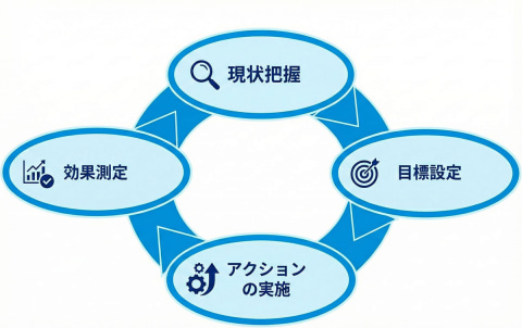 そして4)効果測定では、2)で定めたKGIやKPIなどの指標に基づきアクションの結果を測定し、次のサイクルにつなげるために指標を見直すとのこと。