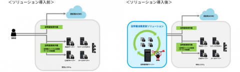 今回提供される「証明書自動更新ソリューション」は、こうした課題に対処するためのもの。証明書の発行から入れ替え作業までをすべて自動で実施できるため、手動更新と比べて運用時の作業負荷を低減できるほか、更新忘れや作業ミスによる証明書期限切れのリスクを防止できる。