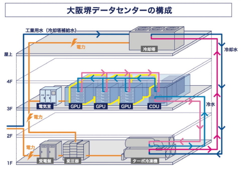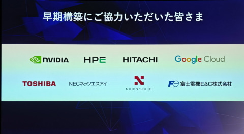 さらに、大阪堺データセンターの構築にあたり、いわゆるデータを処理する部分には、NVIDIA、HPE(Hewlett Packard Enterprise)、日立、Google Cloudが協力したと説明。同時に、データセンターの施設部分では、東芝(電源、UPSなど)、NECネッツエスアイ(セキュリティー、認証)、日本設計(施設の設計部分)、富士電機E&C(冷却関連)などのパートナー企業の協力を仰いだとして、それらの企業の協力もあり、約1年強という短い期間で工場からデータセンターへの転換を行えたと述べた。