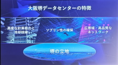 KDDI 松田氏は「データ基盤の国内安定供給を目指した経済産業省の取り組みに従って、日本の産業競争力を高めていこうという取り組みを行っている。KDDIはデータセンター事業として国内外に拠点を持っており、これまで培ってきた通信基盤に加えて、AI基盤を持って両輪で日本のデジタル社会を支えていき、取り組みを加速していく。今回は堺市とご縁があり、大変うれしく存じている」と述べ、KDDIが日本の産業界をバックアップする目的でこの大阪堺データセンターを開設したのだと強調した。