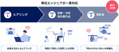 キヤノンITSのセキュリティ専任技術者がヒアリングを実施した上でセキュリティ対策状況を診断・可視化し、報告会にて解説する。ヒアリングに基づく簡易な診断のため、本番環境アクセス/実機確認/エビデンス取得/関係資料提示などの事前準備は不要で実施できる。