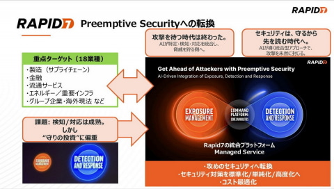 松田氏は、日本企業のセキュリティ対策について、「長年“敵を知らないまま守る”待ちの姿勢に偏り、脆弱性の可視化不足や投資の分散が続いてきた。今後は攻撃を待つのではなく、先を読んで対処するセキュリティへの転換が必要だ。ラピッドセブンはこれをワンプラットフォームで実現する」と述べた。