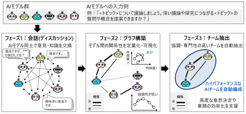 この技術は、従来の「タスク要件から役割を決める(トップダウン型)」ではなく、「AIモデル同士の会話から相性を見極めて、タスクに適したチームを編成する(ボトムアップ型)」というアプローチをとる。このアプローチでは、会話のトピックを分野や業務ごとに変えることで、必要な役割や専門性を持つAIモデルを自動的に抽出し、幅広い現場知見とAIの強みを組み合わせたAIチームを構築できる。