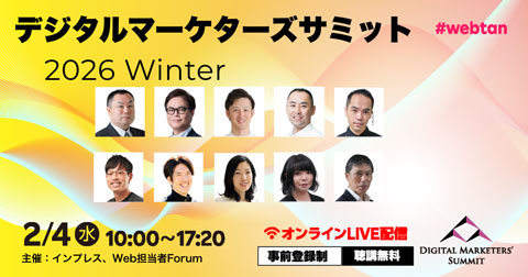 ニュース「Web担当者Forum」、マーケター向けの無料セミナーイベントを2月4日に開催 DMM.com、花王、三菱電機、パナソニックコネクトなどが登壇 編集部2026年1月27日 08:30 株式会社インプレスは、マーケター向けの無料セミナーイベント「デジタルマーケターズサミット 2026 Winter」を2月4日にオンライン形式で実施する。 インプレスが運営するメディア、Web担当者Forumが主催する同イベントには、DMM.com、花王、三菱電機、パナソニックコネクト、Hakuhodo DY ONEなどの担当者が登壇。全17講演以上をラインアップし、AI活用やSEO、Webサイト運用などの最新動向を学べる内容となっている。 開催時間は10時30分~17時20分。事前登録制でイベントページから申し込みを受け付けている。