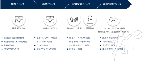 サービスでは、「構想」「基礎」「個別定着」「組織定着」の4フェーズで約2.5カ月間の研修を実施する。「構想」は、目標やゴールのすり合わせ、環境や受講者のスキルを確認する(1時間/1日)。「基礎」は、座学とハンズオン形式でAIエージェントの基礎を学ぶ(2~3日間・3~4時間/1日あたり)。「個別定着」は、パーソルビジネスプロセスデザインの専門家が1on1を実施し、業務を題材にした開発状況を確認して支援する(8週間・1時間/1日あたり)。「組織定着」は、他部門に展開していくためのコミュニティ・支援の仕組み・ルール整備を支援する(期間は内容により異なる)。
