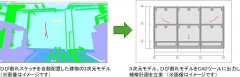 さらに、作成された3次元モデルとひび割れモデルをCADツールに出力して、補修箇所の2D図面やリストを生成し、これをもとに補修計画を立案・実施できるとした。