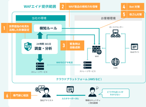 GMOサイバーセキュリティ WAFエイドは、WAFを24時間365日自動で運用するサービス。GMOインターネットグループのインフラ基盤に関する知見と、ホワイトハッカー集団の専門知識を活用し、顧客のWAFに強固な防御設定を施す。GMOサイバーセキュリティ byイエラエのセキュリティアナリストがチューニングした設定は自動でWAFに反映されるため、顧客の作業は不要で利用できる。