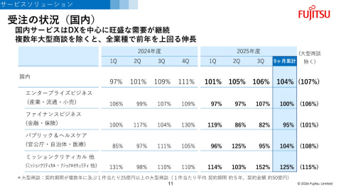 国内サービスソリューションの9カ月累計の受注状況は、全体では前年同期比4%増となった。だが、契約期間が複数年に及ぶ1件当たり25億円以上の大型商談(1件当たり平均契約期間約5年、契約金額約50億円)を除くと7%増となっている。