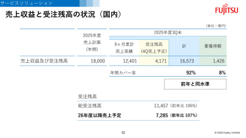 国内サービスソリューションにおける売上収益と受注残高の状況についても説明。2025年度の売上収益1兆8000億円の計画に対して、第3四半期までの実績と、第4四半期に売上計上予定の受注残高の合計は1兆6573億円となり、年間カバー率は92%に到達している。「これは前年度と同じ水準であり、堅調な進捗である。商談パイプラインの数量も拡大している。引き続き、デリバリー体制の確保をしっかりと進め、ビジネス拡大に取り組む」とした。