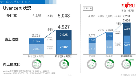 内訳は、Verticalの売上収益が前年同期比77%増の2025億円(前年同期実績は1147億円)、Horizontalの売上収益は同40%増の2902億円(同2069億円)。また、Fujitsu Uvanceの受注高は、前年同期比45%増の5048億円となった。