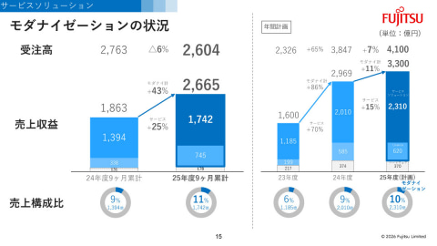 モダナイゼーションの売上収益は前年同期比43%増の2665億円となった。受注高は同6%減の2604億円となっている。「受注減の要因は、前年度に大型案件を立て続けに獲得したことの反動によるもの。受注残高は大きく積み上がっており、デリバリーのためにSEの稼働率は高い水準が続いている。年間の売上目標の3300億円を上回るペースで進捗している」と語った。