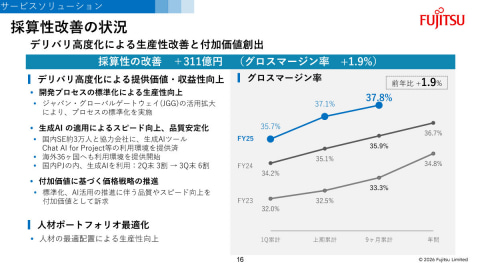 一方、採算性改善における利益増は311億円となり、グロスマージン率は前年同期比1.9ポイント増の37.8%となった。ジャパン・グローバルゲートウェイ(JGG)の活用拡大により、プロセスの標準化や自動化を推進。開発工程への生成AIの適用を加速しており、国内に加えて、海外36カ国にAI活用を展開したという。