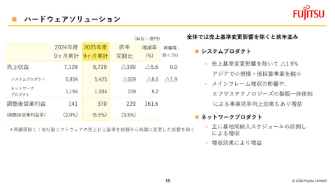 ハードウェアソリューションの売上収益は前年同期比5.6%減の6729億円、調整後営業利益は229億円増の370億円。そのうち、システムプロダクトの売上収益は同8.6%減の5425億円、ネットワークプロダクトの売上収益は同9.2%増の1304億円となった。ハードウェアソリューション全体では、売上基準変更影響を除くと前年並みだという。