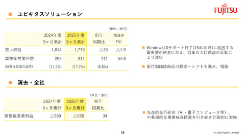 富士通株式会社は29日、2025年度第3四半期(2025年4月~12月)の連結業績を発表。売上収益が前年同期比1.8%増の2兆4511億円、営業利益は同99.4%増の2110億円、調整後営業利益は同67.1%増の2291億円、税引前利益が同132.2%増の2651億円、当期純利益が同290.3%増の3436億円となった。