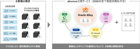 Oracle Alloyの導入によって刷新されるabsonneの次期サービスでは、Oracle Cloud Infrastructure(OCI)が提供する「Oracle Autonomous AI Database」をはじめとする、200以上のクラウドおよびAIサービスを活用することで、日本企業のデータ主権要件に対応し、運用および管理を日本国内で完結できるソブリンクラウド環境を顧客に提供する。また、NSSOLが強みとする運用サービス「emerald」、サイバー攻撃対策「NSSIRIUS」、コンサルティングサービス「xSource」などをOracle Alloyに最適化し、オプションメニューとして提供する。