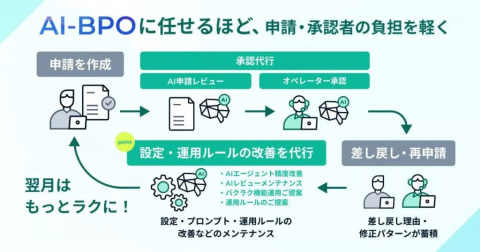具体的には、社内規定・ルールと「バクラク経費精算」の過去の申請データを基にAIエージェントを主体として申請のチェックを実施するとともに、オペレーターが最終確認を行うことで、速度と品質を兼ね備えた承認業務を提供する。また、差し戻しをはじめとするオペレーターのフィードバックがAIの精度改善に活用され、代行を重ねれば重ねるほど高速かつ正確な承認業務を実現できるとのこと。
