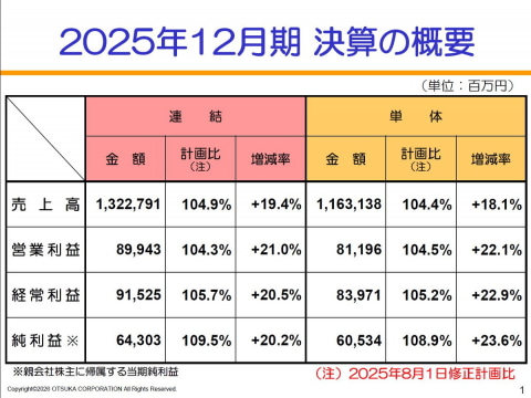 株式会社大塚商会は2日、2025年12月期(2025年1月~12月)の決算を発表した。連結売上高は前年比19.4%増の1兆3227億9100万円、営業利益は同21%増の899億4300万円、経常利益は同20.5%増の915億2500万円、親会社株主に帰属する当期純利益は同20.2%増の643億300万円となり、売上高・各利益ともに3年連続で過去最高となった。