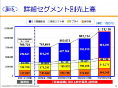 単体の詳細セグメント別売上高は、SI関連商品が6853億100万円、受託ソフト等が663億9900万円、サプライが2120億7100万円、保守等が1993億6500万円となった。