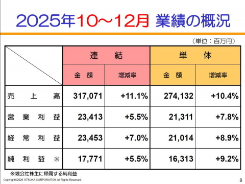 なお、10~12月期の業績を見ると、連結売上高は前年比11.1%増の3170億7100万円、単体売上高は前年比10.4%増の2741億3200万円と2桁増となり、「大きな自信となった」(大塚社長)という。