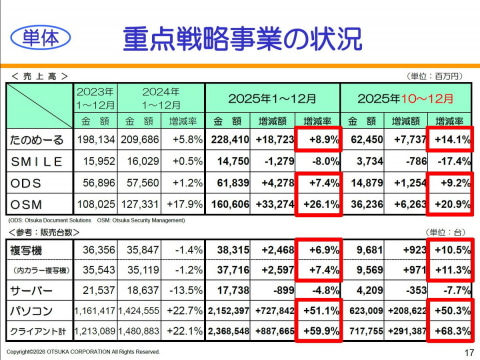 通期の重点戦略事業の状況は、たのめーるが前年比8.9%増の2284億1000万円、SMILEが同8.0%減の147億5000万円、ドキュメントソリューションのODSが同7.4%増の618億3900万円、セキュリティソリューションのOSMが同26.1%増の1606億600万円。複写機は同6.9%増の3万8315台で、そのうちカラー複写機が同7.4%増の3万7716台。サーバーは同4.8%減の1万7738台、パソコンは同51.1%増の215万2397台で、タブレットなどを含めたクライアント合計では同59.9%増の236万8548台となった。