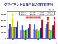 クライアントの販売台数の四半期推移では、2025年度はWindows 10のEOSに加え、GIGAスクールのクライアント販売という特需もあったという。