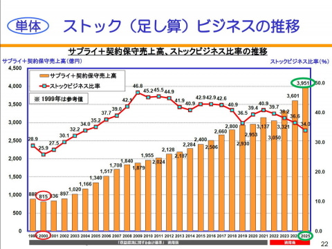 単体のストックビジネス推移では、2025年度はサプライと契約保守売上高が3951億円となった。「ストック以外の売上が伸びているため、ストックビジネス比率は下がっているが、堅調な伸びとなっている。なお、2025年度から収益認識基準の変更が行われた。過去にはコピー機関連の補修を大塚商会で計上していたが、それが計上できなくなった。その部分を巻き戻しても保守売上は右肩上がりを継続し、一度も下がっていない。過去も、リーマンショック、東日本大震災などの異変があった際にも一度も下がっておらず、大変心強い。将来の大塚商会を引っ張っていく安心材料であり、今後もストックビジネスを重視していく」ことを強調した。
